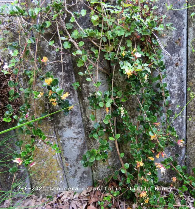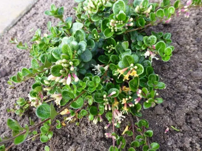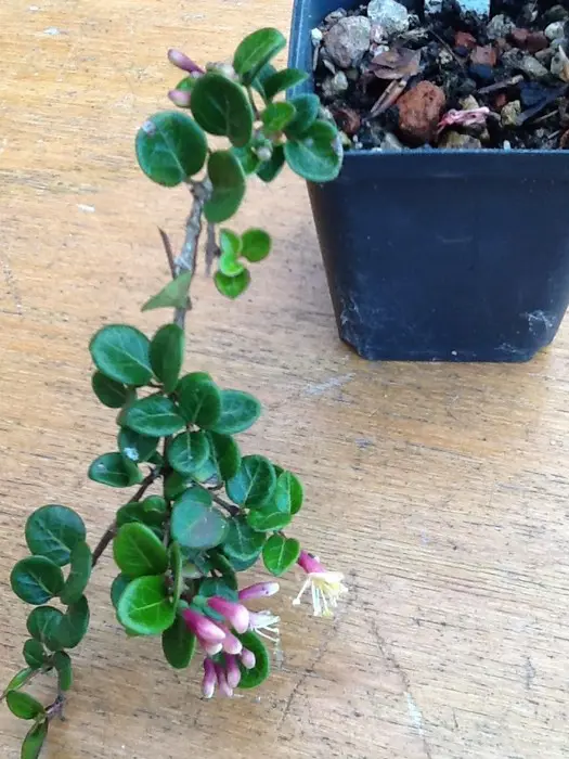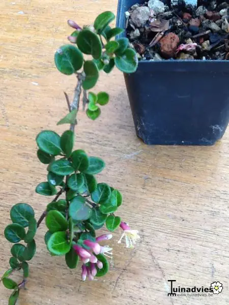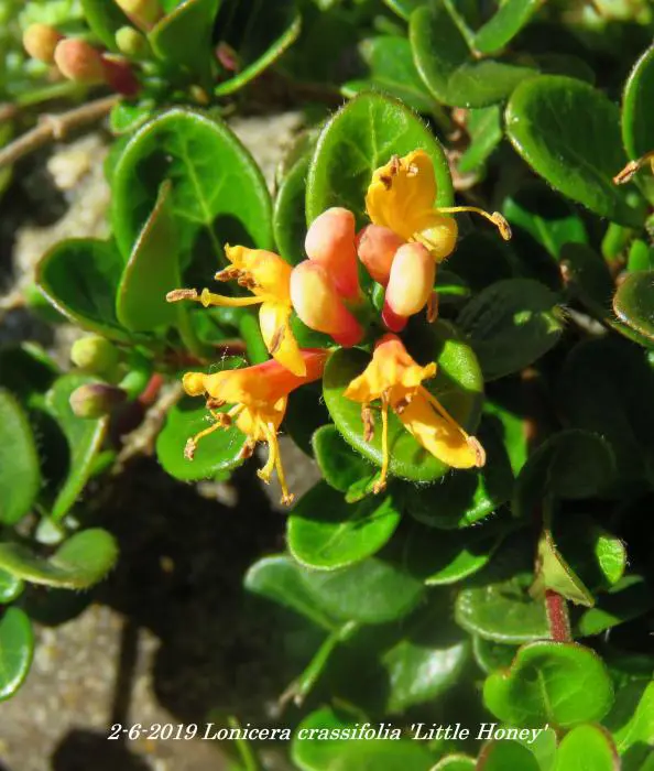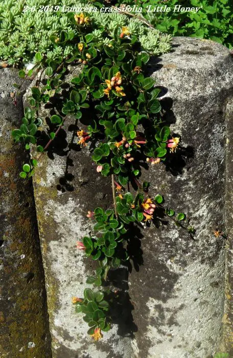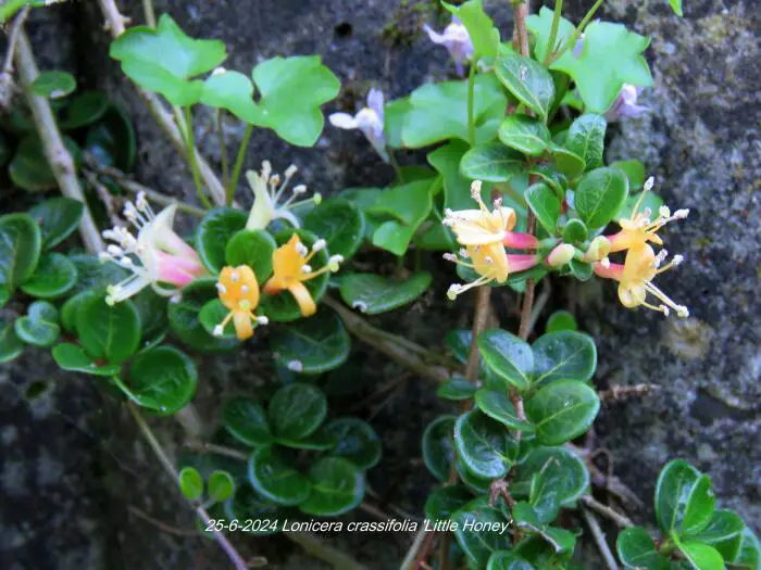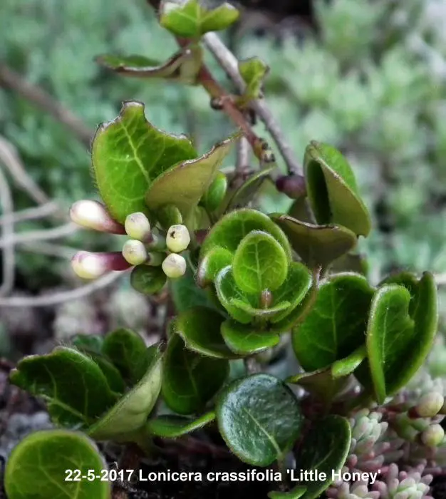 Lonicera crassifolia 'Little Honey' is een klein kruipende kamperfoelie met glanzende groene ronde blaadjes en roze/roomgele bloemen gevolgd door paarse besjes.