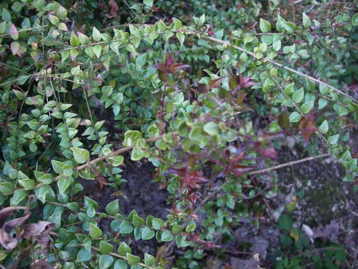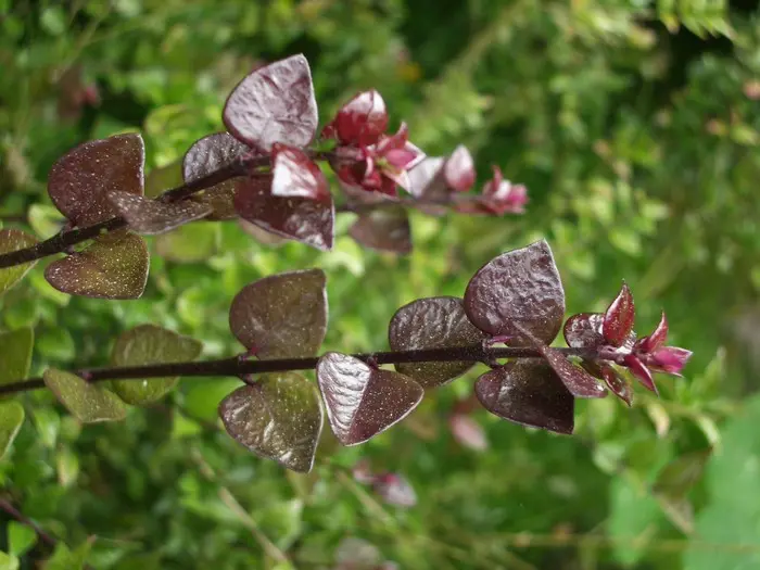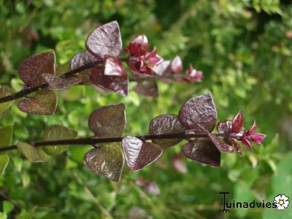 Lonicera nitida 'Red Tips' heeft een meer gespreide groei en loopt in het voorjaar met wijnrode scheuten uit. Het volwassen blad is glanzend groen.