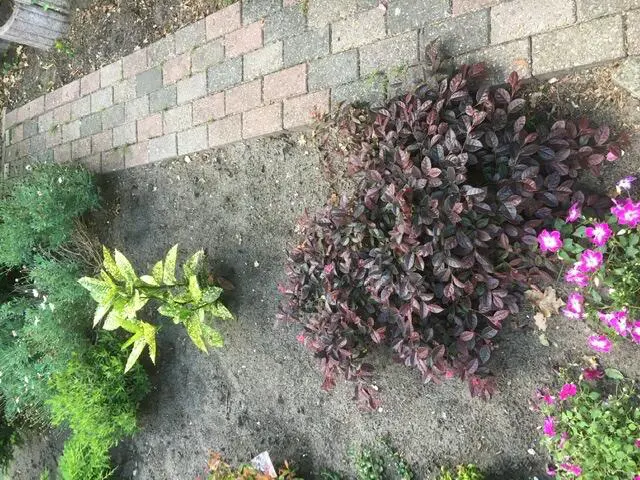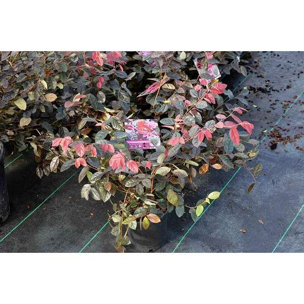 Het blad is bronsgroen/rood met roze jonge twijgjes.