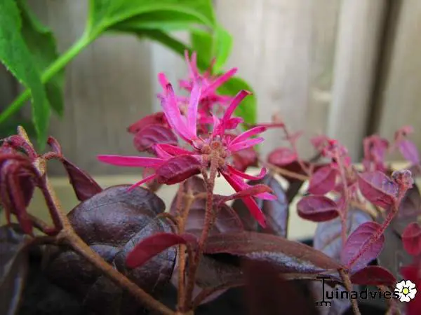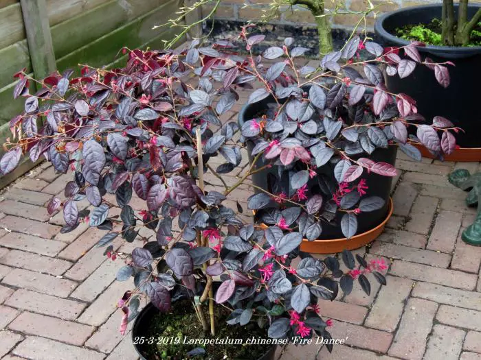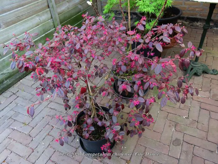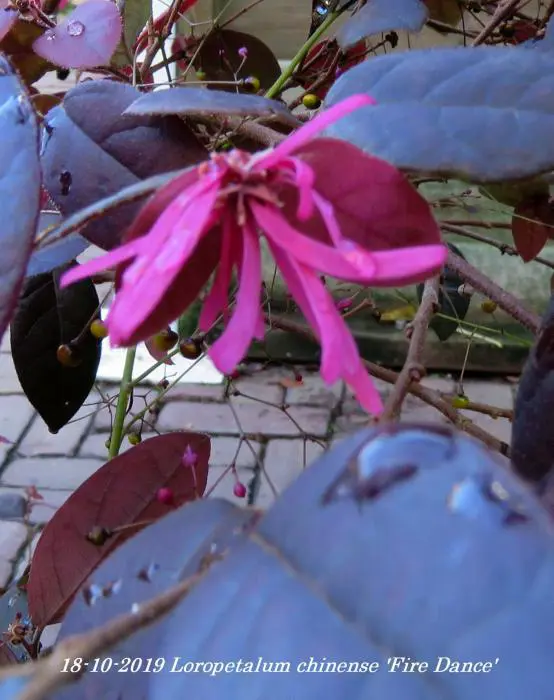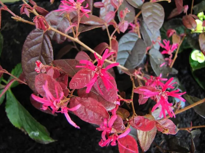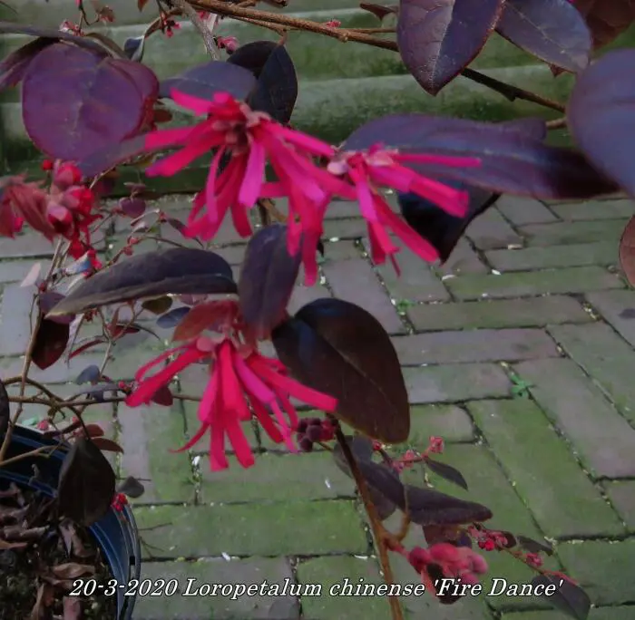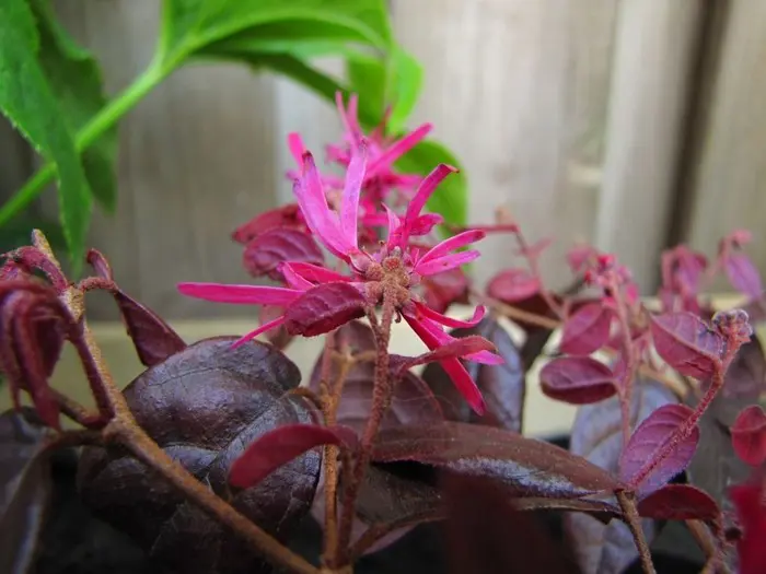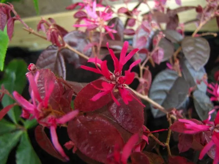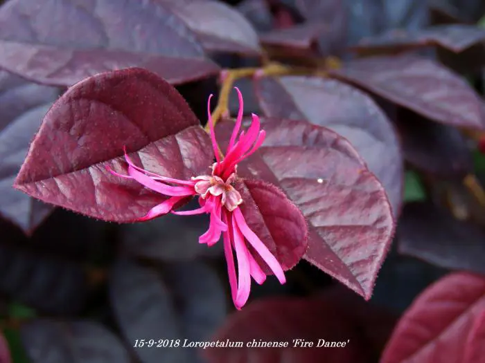 Loropetalum chinense 'Fire Dance' bloeit met rozerode bloemen die op de Hamamelis (toverhazelaar) lijken.