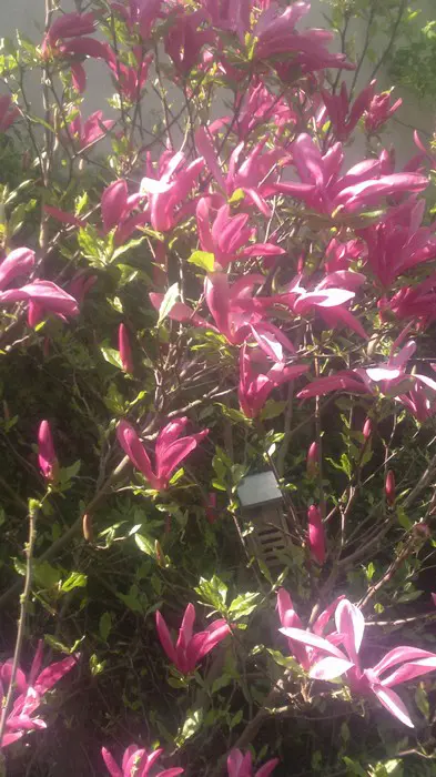 Langwerpige bloemen bij Magnolia liliflora of M. 'Susan'.