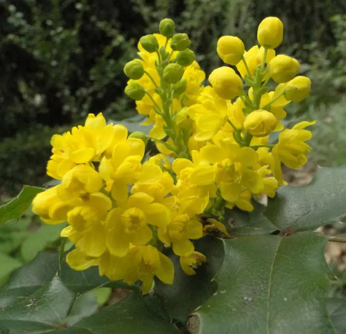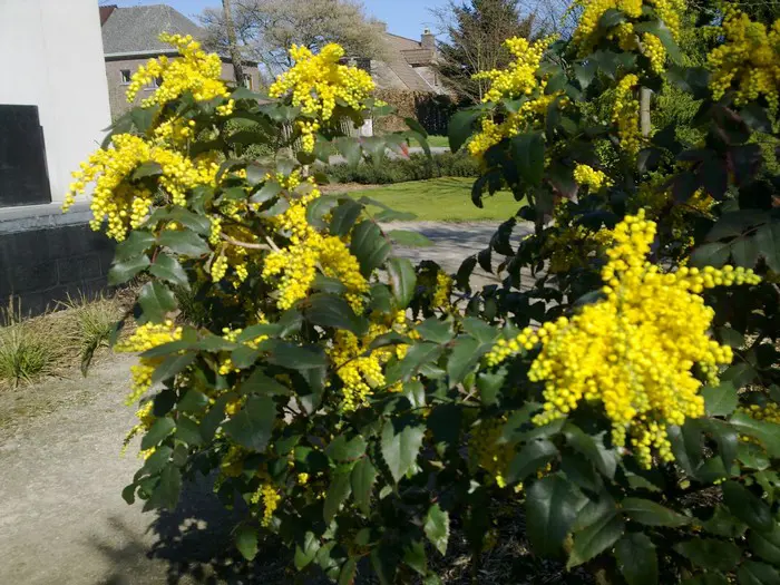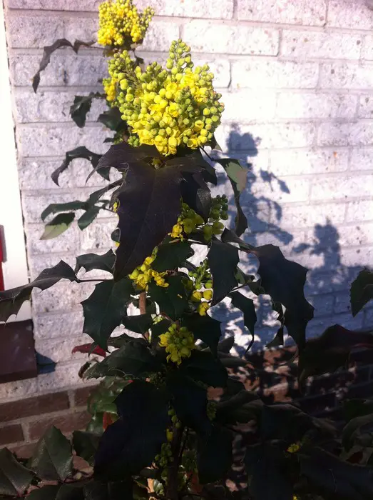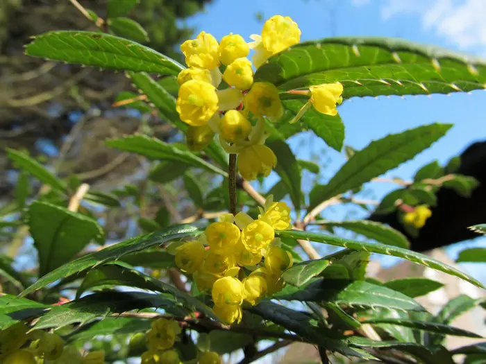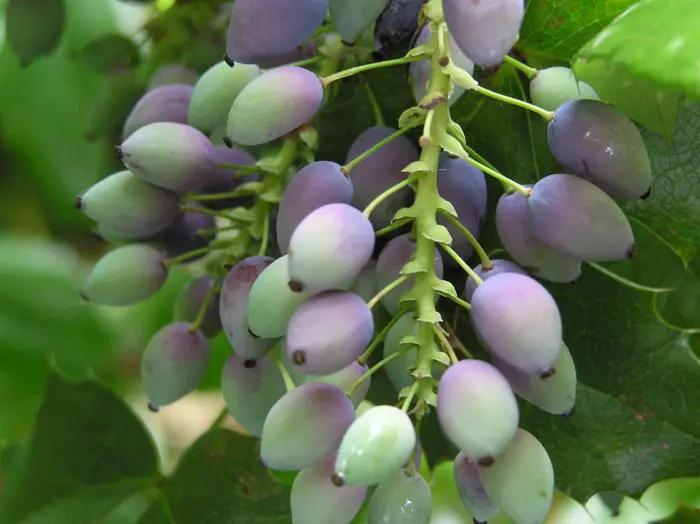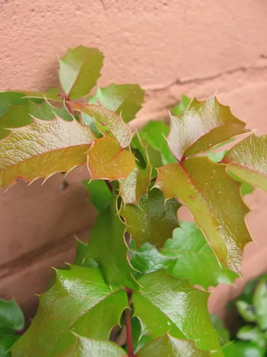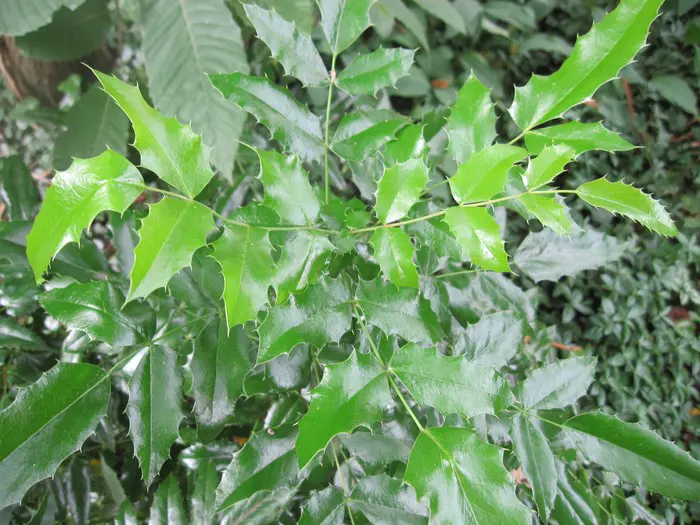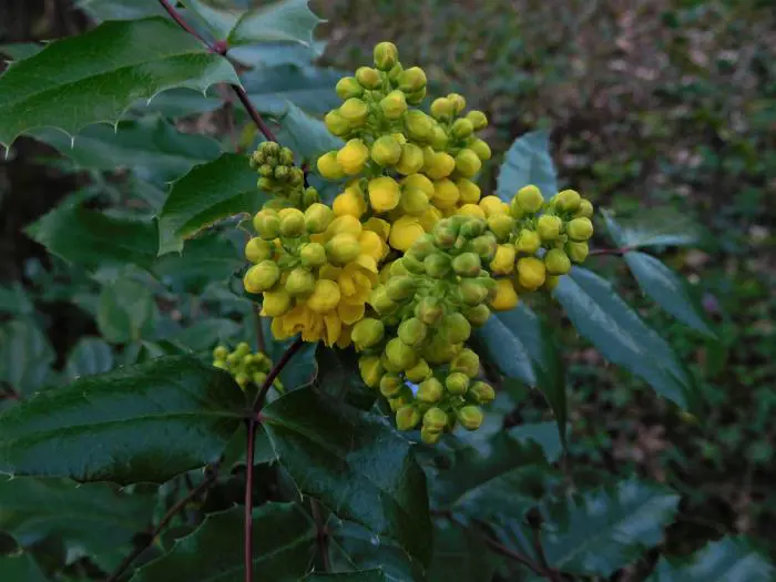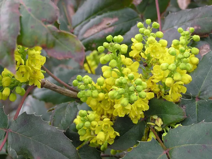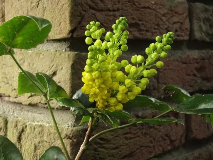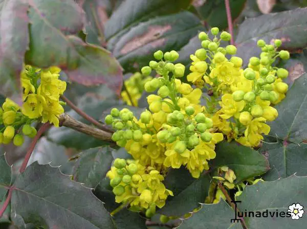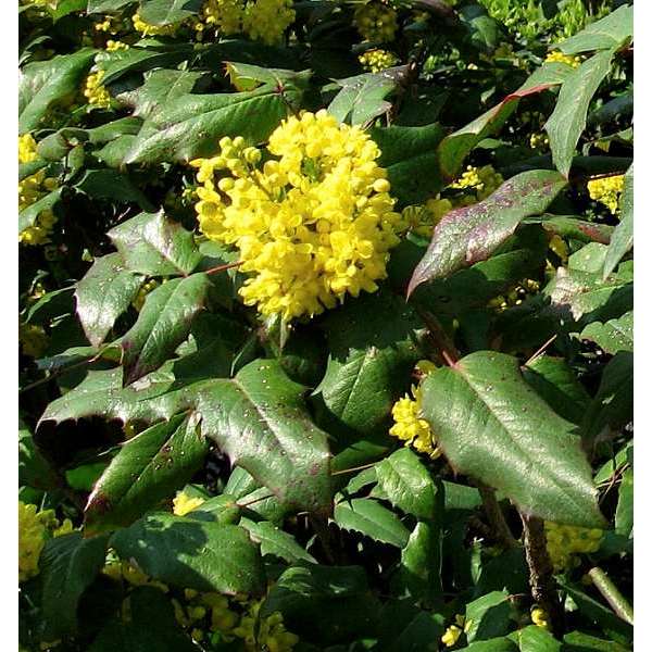 Mahonia aquifolium is een traag groeiende, bossige en stekelige struik met opgaande twijgen en glanzend groen, hulstachtig blad dat in het najaar brons/purper verkleurd.