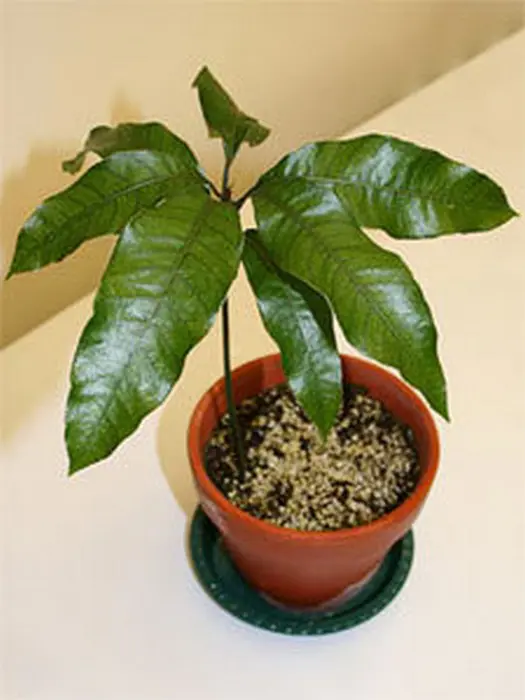 Mangifera indica heeft een brede dichte kroon met glad en glanzende bladeren.