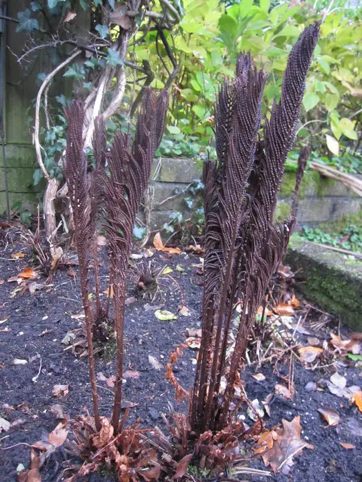 De veren lijken op de mannetjesvaren maar staan rechtop in bundels, iets gebogen als struisveren.