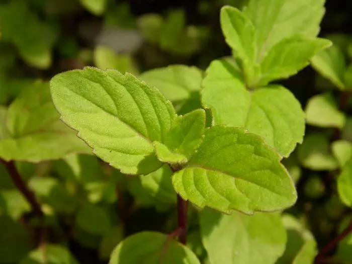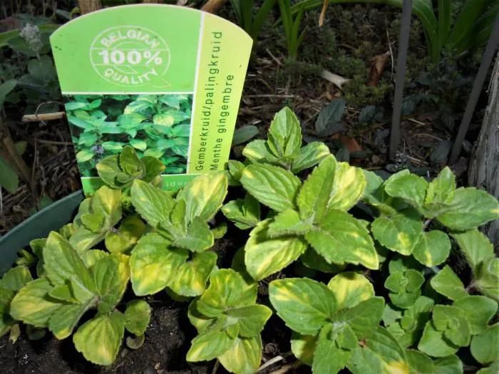 Mentha × gracilis heeft kleine langwerpige geelgroene blaadjes met soms een zweem roodbruin.