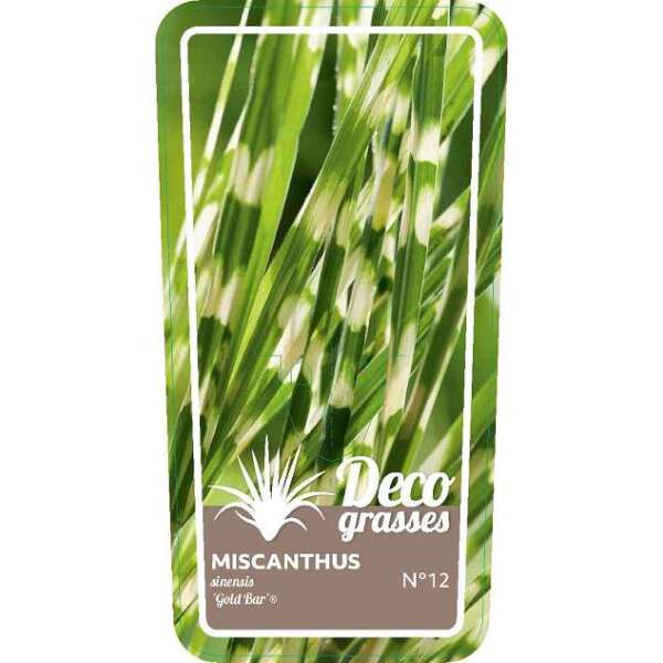 Het blad van de Miscanthus sinensis 'Gold Bar' is groengeel gestreept. De bloei in de nazomer zijn zilverachtig bruinrode bloeipluimen.