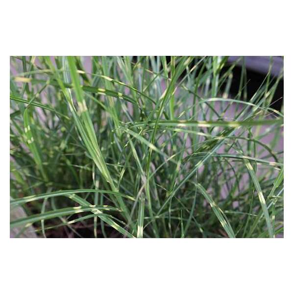 Het blad van Miscanthus sinensis 'Strictus Dwarf' heeft geel gevlekte bladeren.