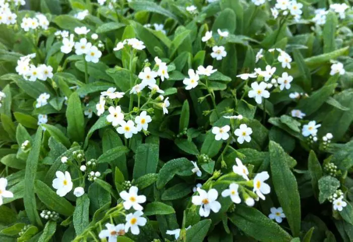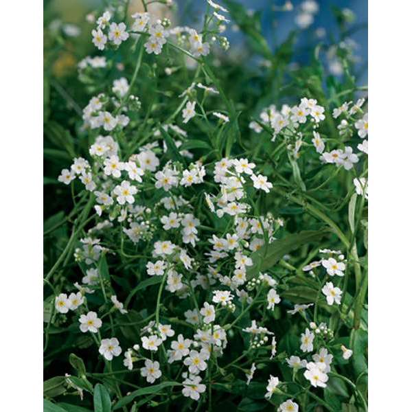Myosotis palustris 'Ice Pearl' is een witbloeiende (overbekende) plant met een geel hartje dat van vochtige tot natte grond houdt, deze nog meer dan de gewone Myosotis.