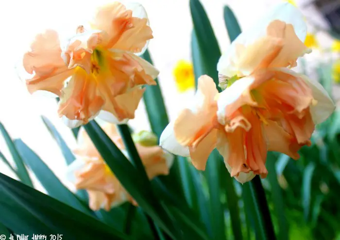 Bloeit met geurende dubbele witte bloemen met een koraal/abrikooskleurige gespleten kroon.