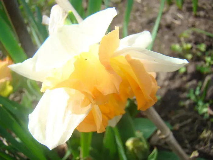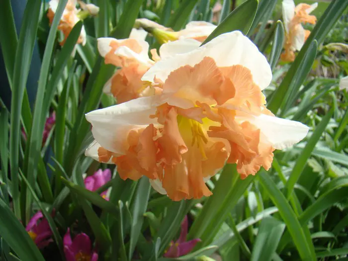 Narcissus 'Sunny Girlfriend' bloeit wit met een gespleten kroon waarvan de randen gerafeld zijn.