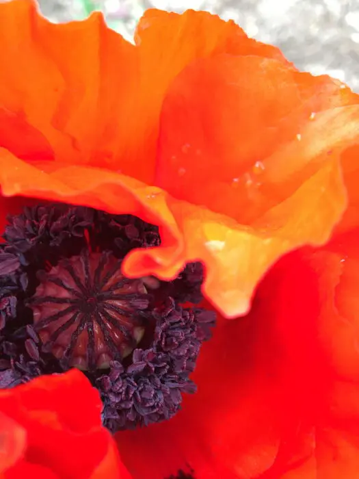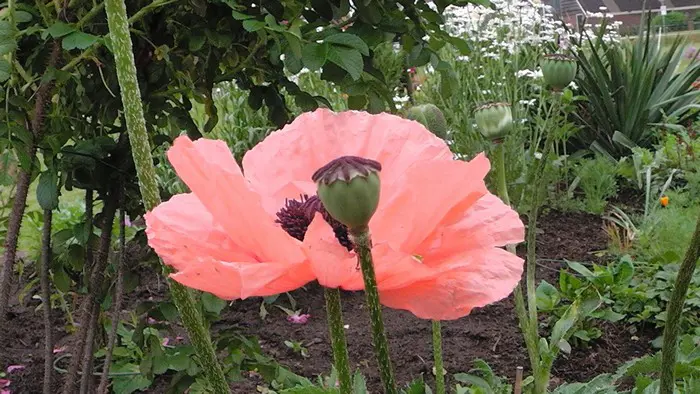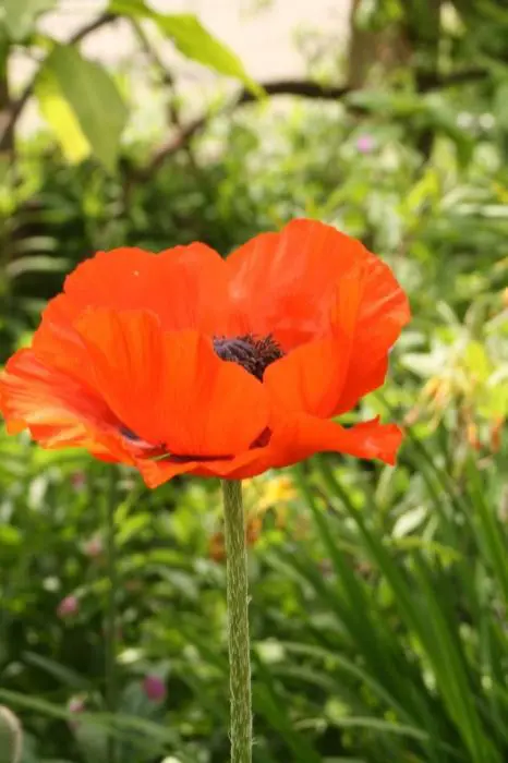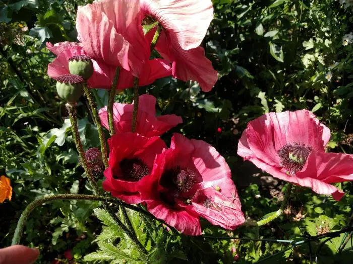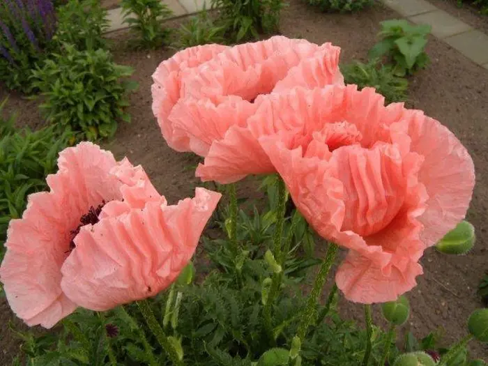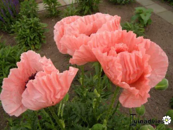 Bloeit op rechtopstaande, behaarde stengels met grote, papierachtige bloemen met meestal een zwarte vlek in het centrum. bloeit in een breed palet van kleuren, die variëren van felrood, zalmroze, lilapaars, roze, oranje tot wit.