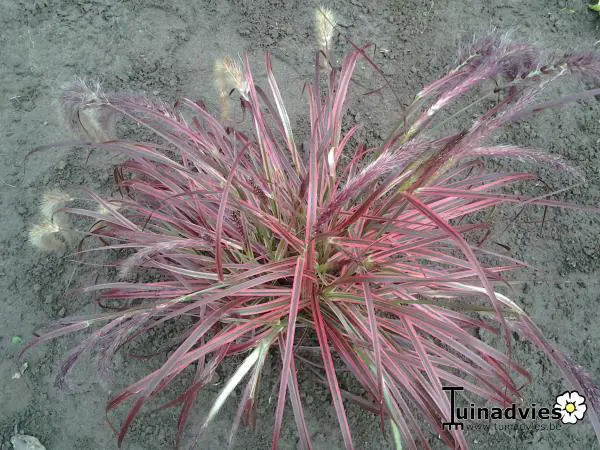 Pennisetum advena 'Fireworks' heeft opvallende rozerode/bruin/groene bladeren met paarsroze pluimen.