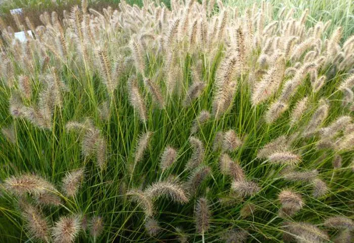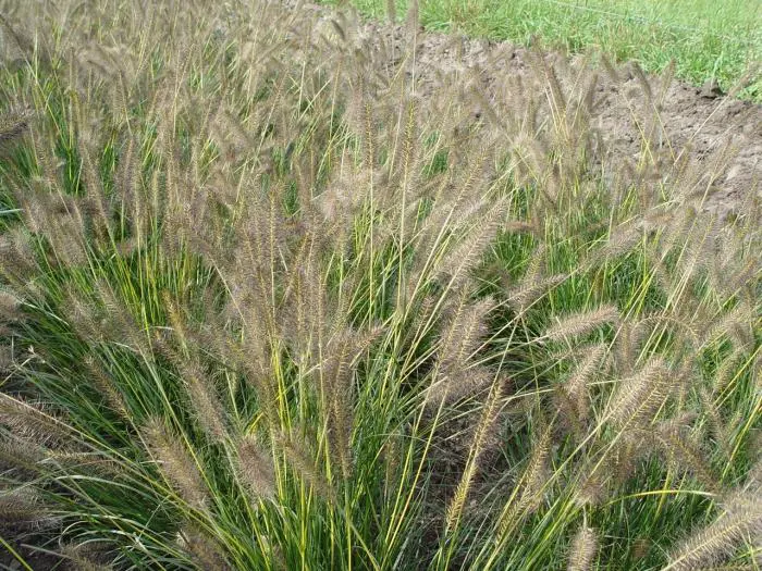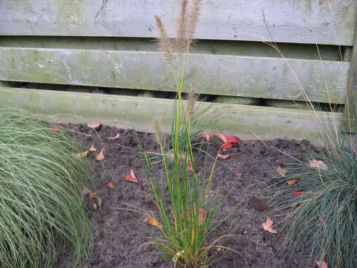 Pennisetum alopecuroides 'Gelbstiel' heeft zoals de naam al doet vermoeden een gele bloemstengel en die wordt zo'n 50 cm hoog waardoor de bloeiaartjes een 20 cm boven het gebladerte uitsteken.