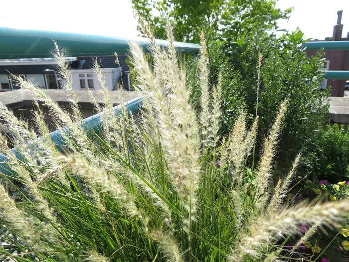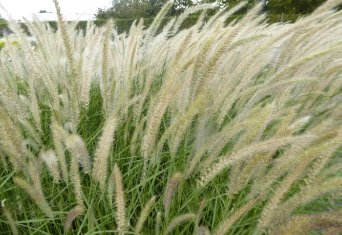 Het grasachtig blad van de Pennisetum orientale 'Fairy Tails' is glanzend grijsgroen.