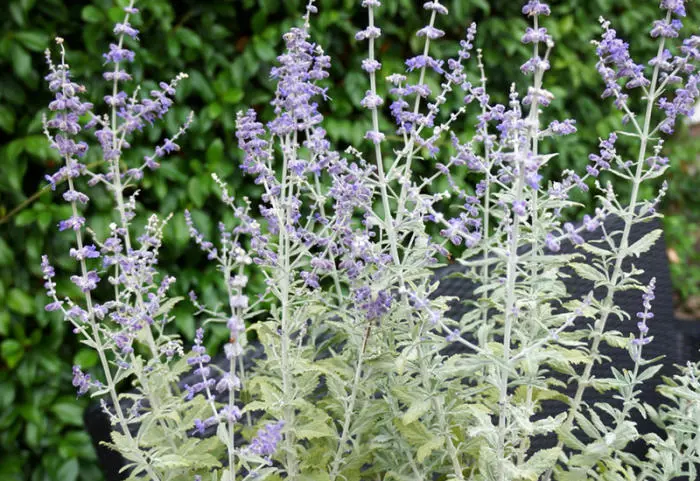Perovskia atriplicifolia 'Silvery Blue' is een cultivar met zilver blad, blijft lager dan de soort +/-50cm.