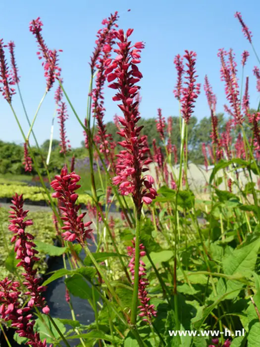Bloeit op rechtopstaande stengels met dichte aarvormige lichtroze tot rozerode bloemen gevolgd door glanzend, bruin fruit.