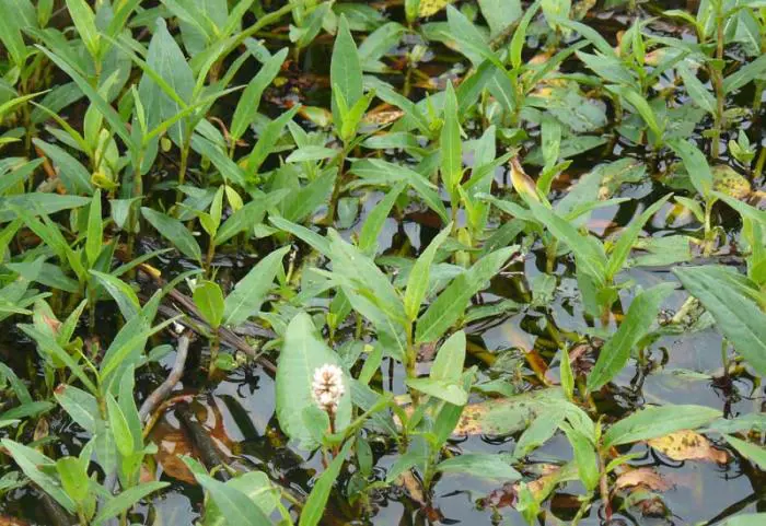 Persicaria amphibia is een aquatische, rhizomateuze vaste plant met lange, meestal lancetvormige groene bladeren die op het water drijven.