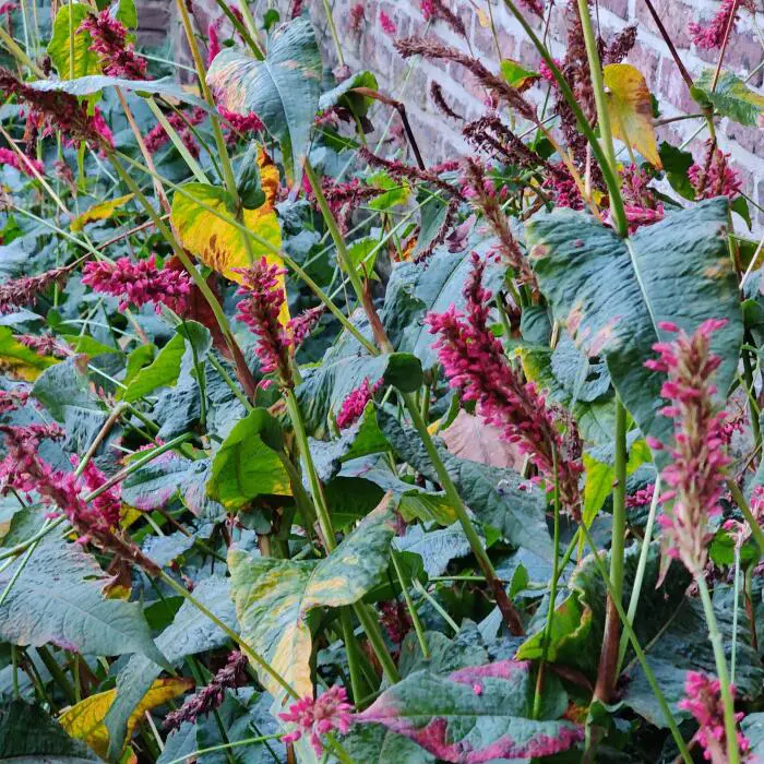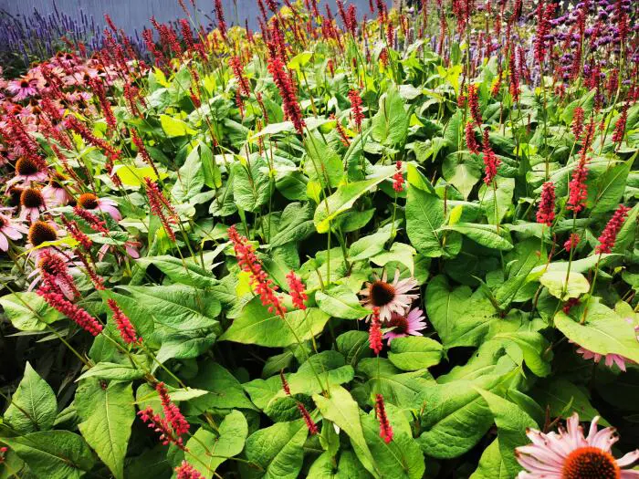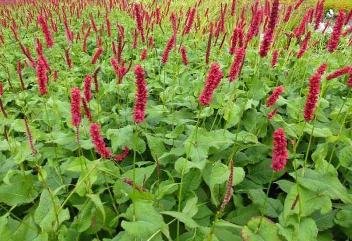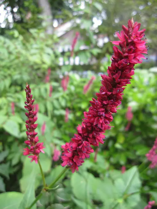 Persicaria amplexicaulis 'Fat Domino' bloeit met dikke, donker rozerode aren.