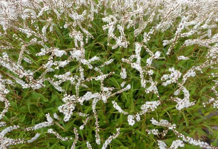 Persicaria amplexicaulis 'White Eastfield' geeft een verticaal accent in de border. Een forse bossige plant die vooral mooi uitkomt in grotere groepen.