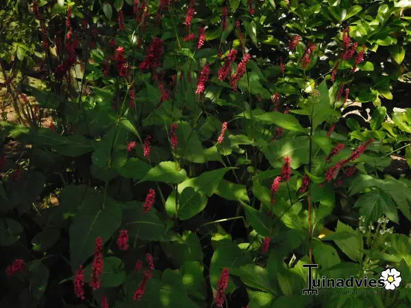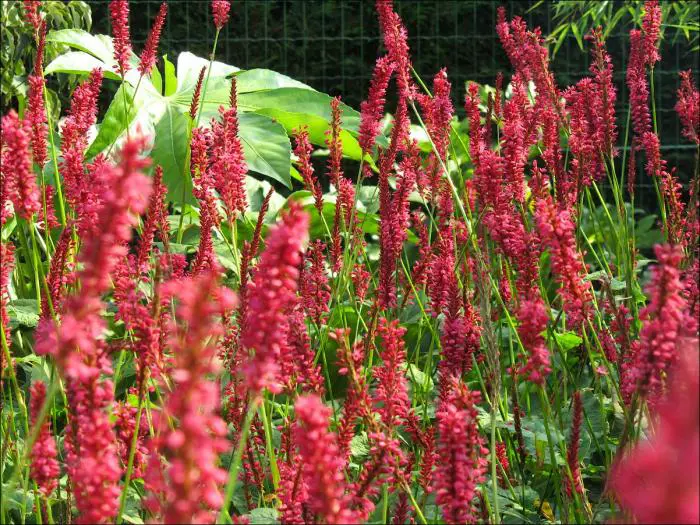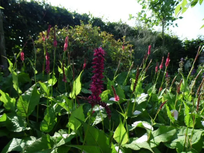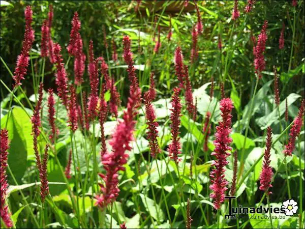 Persicaria amplexicaulis ‘Speciosa’ is een forse bossige plant met donker karmijnroze bloeiaren die vooral mooi uitkomen in grotere groepen.