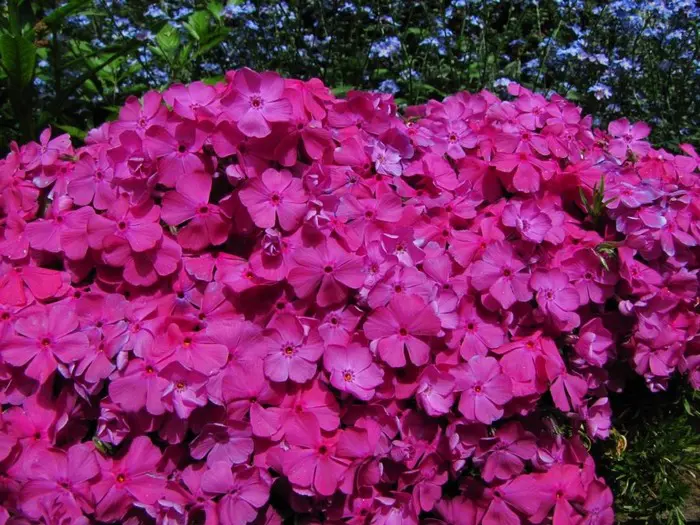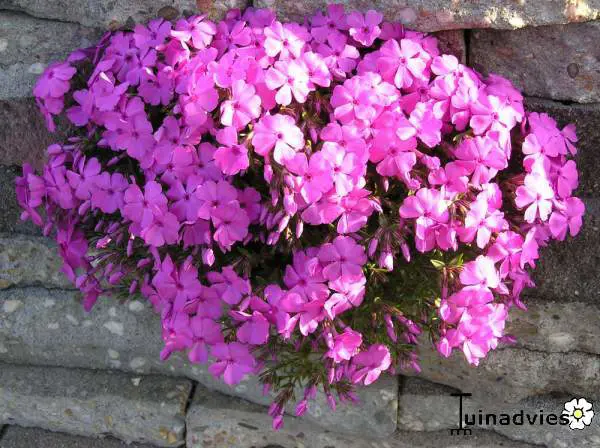 Een groenblijvende bodembedekker met kleine paarsroze bloempjes in trosjes.
