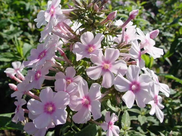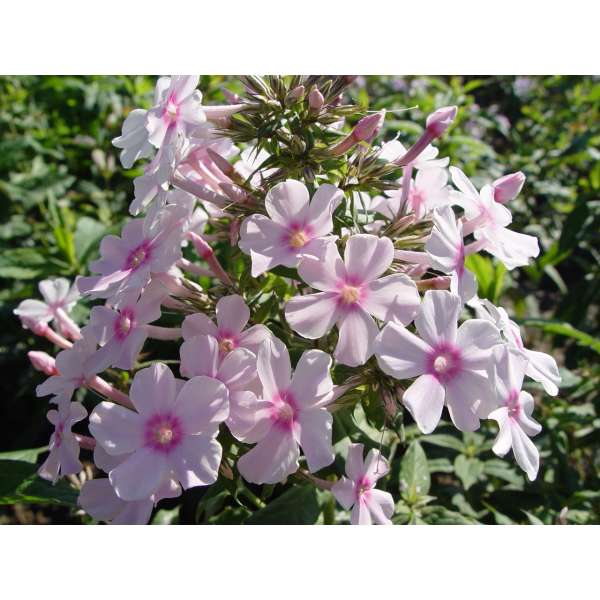 Phlox paniculata 'Eden Tuin' bloeit met lichtroze bloemen met een donkerroze oog.