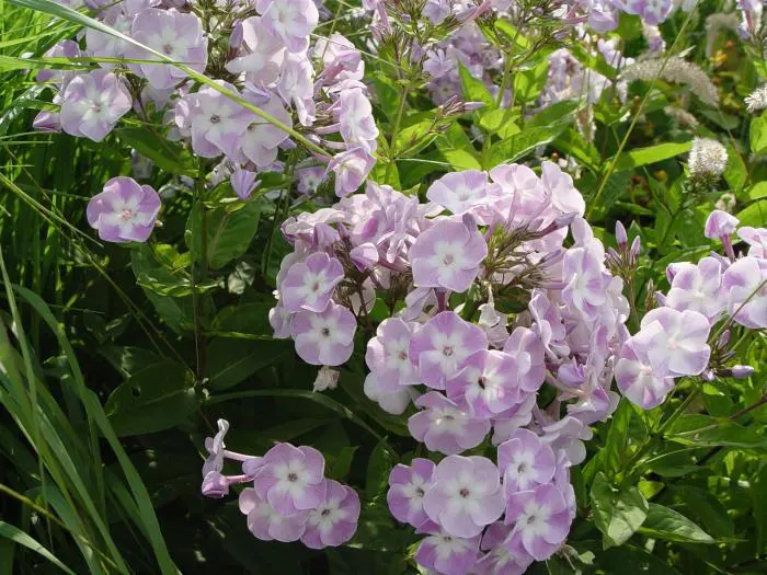 Phlox paniculata 'Katherine' bloeit lavendel met een wit oog.