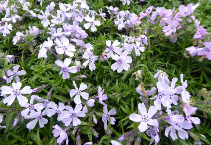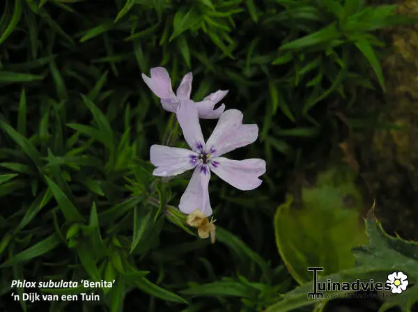 Phlox subulata 'Benita' is een groenblijvende bodembedekker met lilablauwe kleine bloempjes in trosjes.