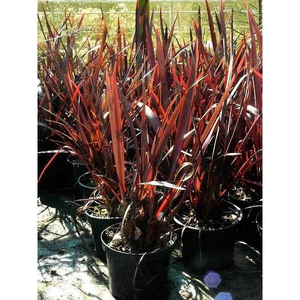 Het stoer blad van de Phormium tenax 'Purpureum' is paarsrood tot bruingrijs en zwaardvormig. Bloeit met prachtige rode bloemen maar bloeit zelden in ons zeeklimaat.