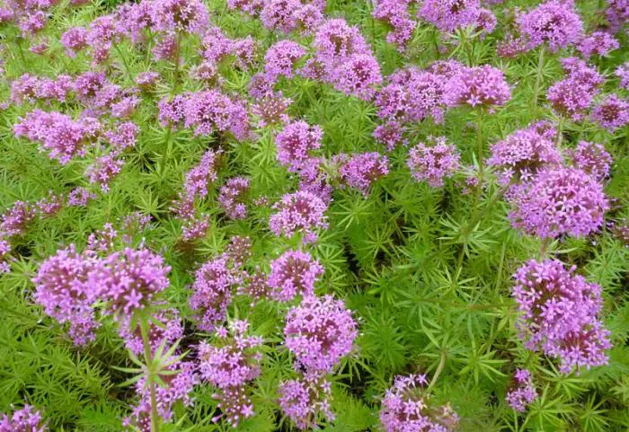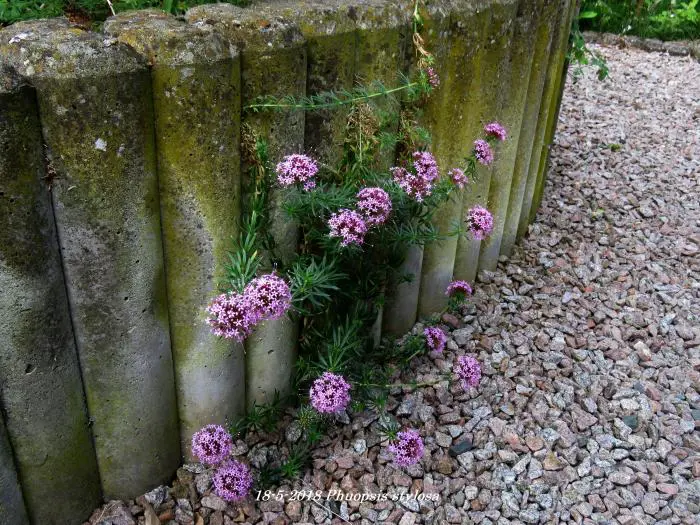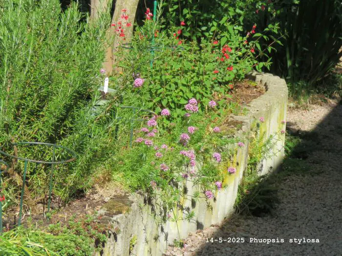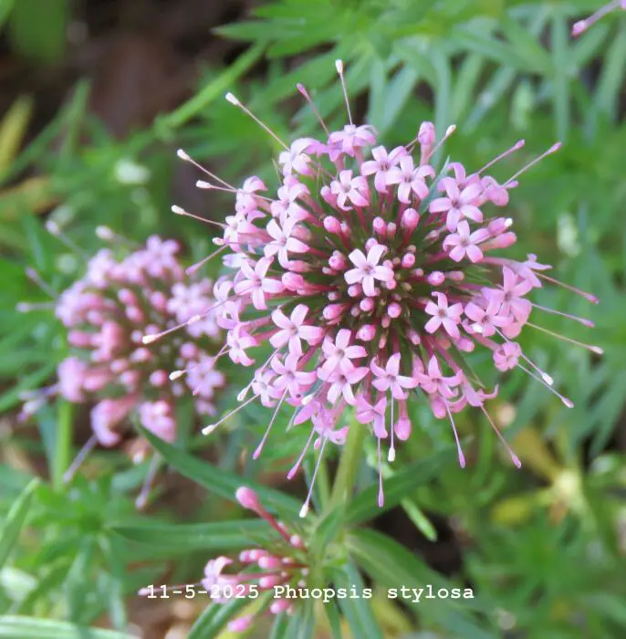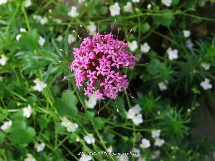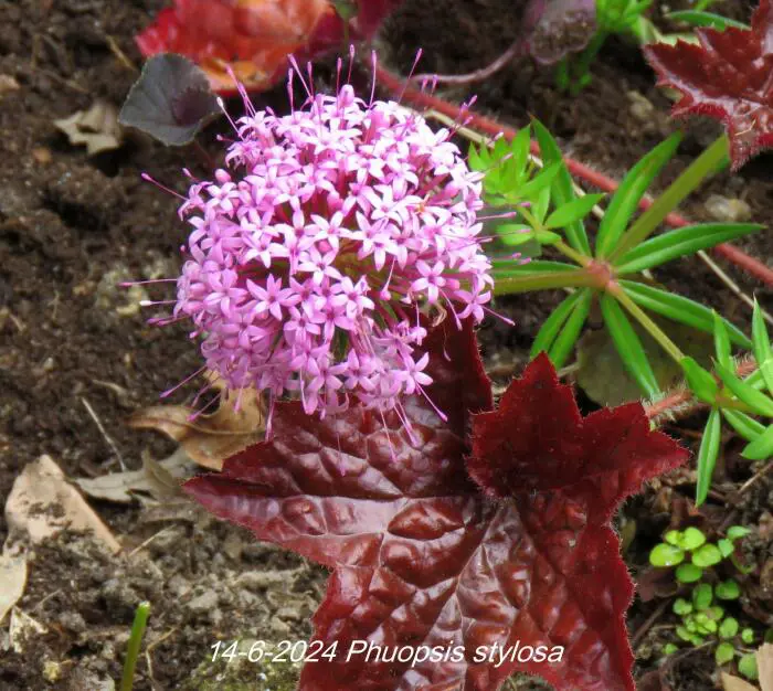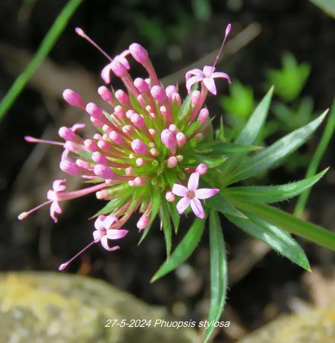 Phuopsis stylosa is een bloeiende bodembedekker met een half bolvormige bloeiwijze van kleine stervormige roze bloempjes.