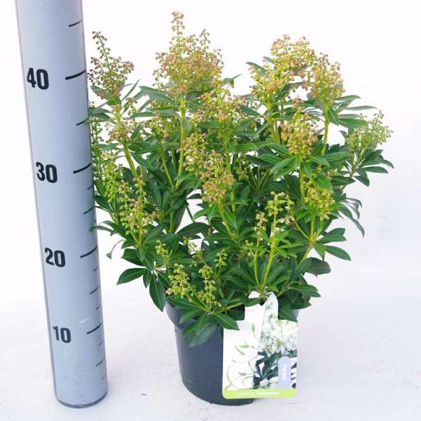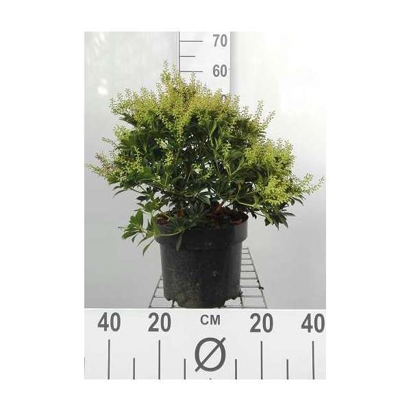 Pieris japonica 'Debutante' is een compacte breedgroeiende heester met in de lente, prachtige hangende trossen van zuiverwitte urnachtige bloemen, zoetgeurend naar honing.