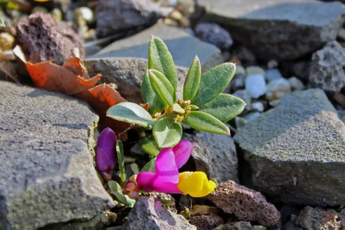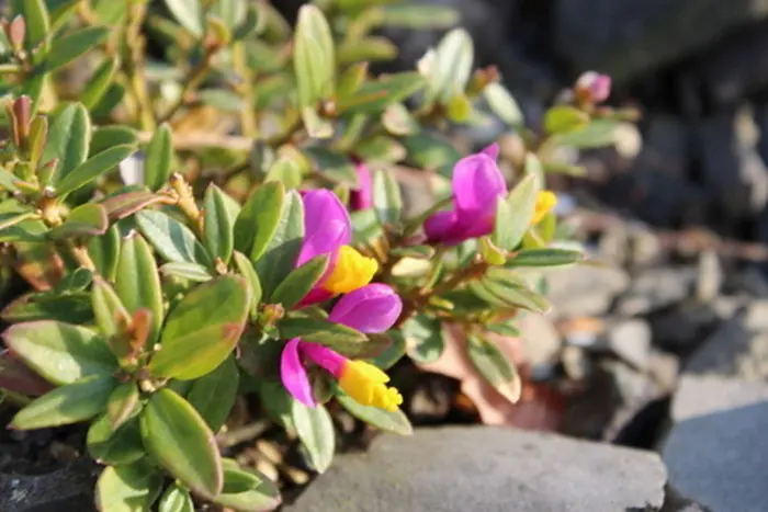In de lente bloeien kleine tweekleurige paarsroze/gele bloemen.