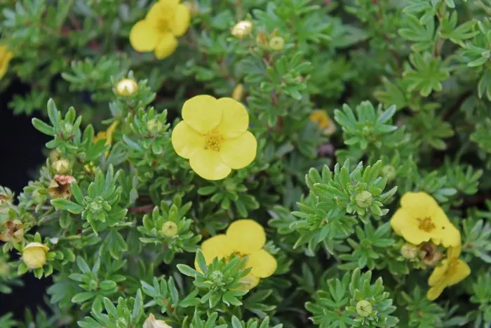 Potentilla fruticosa 'Kobold' is een zeer dichte variëteit met een rijke bloei van komvormige goudgele bloemen die enigszins verbleken in de felle zon.