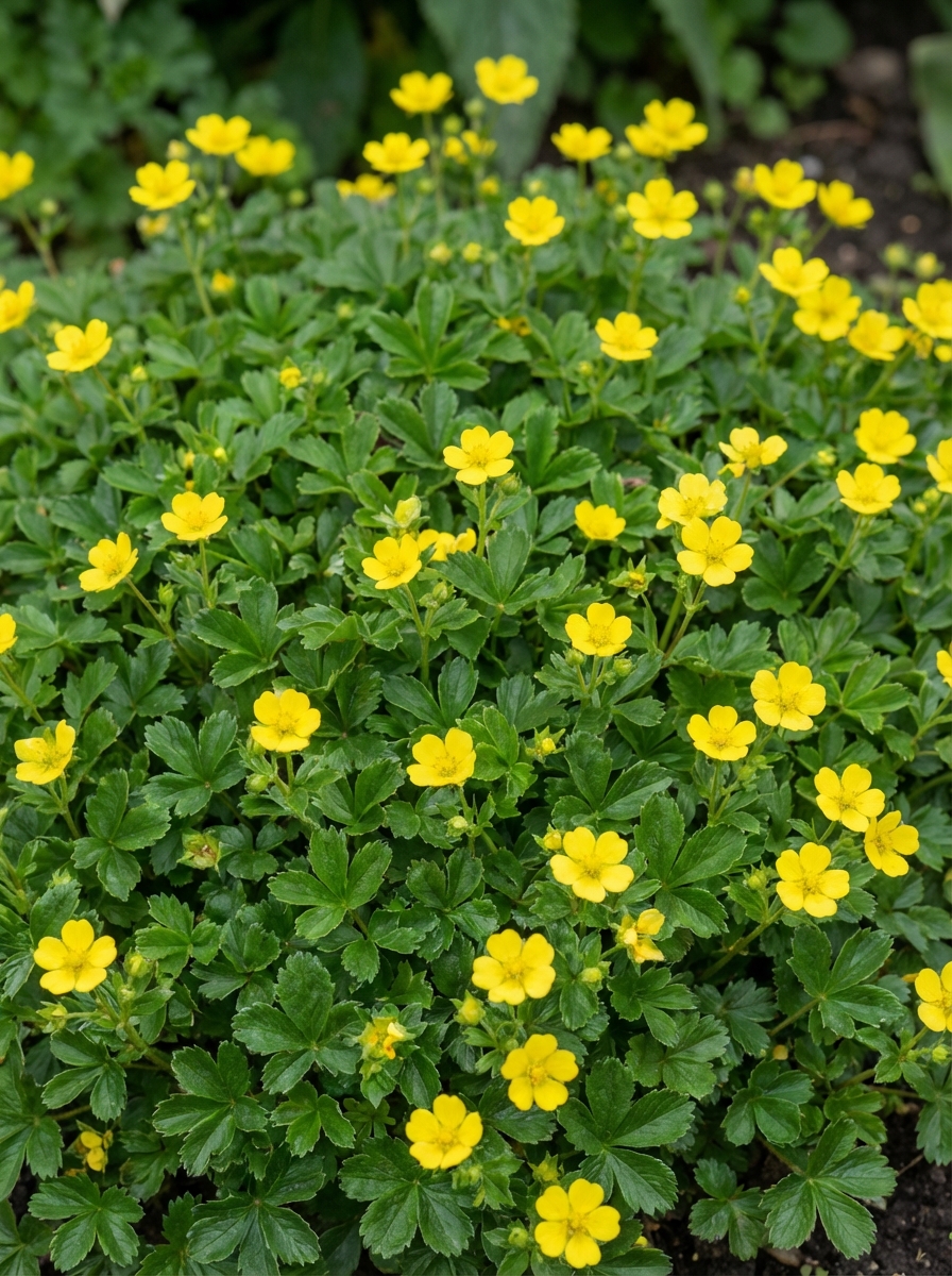 Potentilla neumanniana 'Nana' is een compacte, matvormende heester met kleine, handvormige bladeren en kleine gele bloempjes.