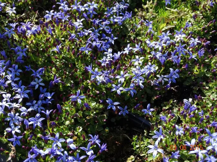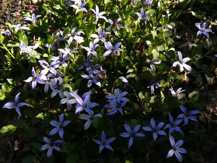 Pratia pedunculata 'County Park' is een langbloeiende plant met stervormige blauwe bloempjes.