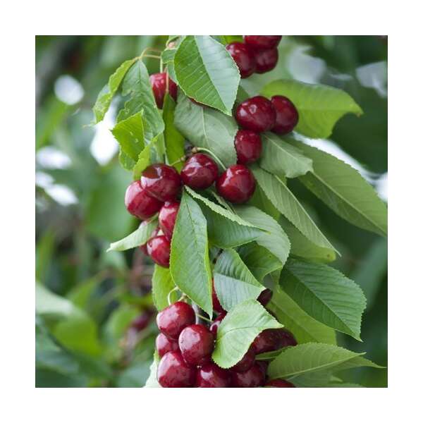 Prunus avium 'Sylvia' is een laagblijvende zuilvormige boom met zoete zwartrode kersen.