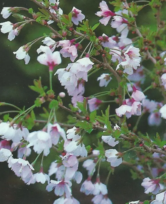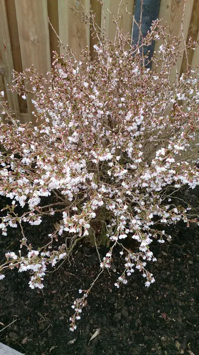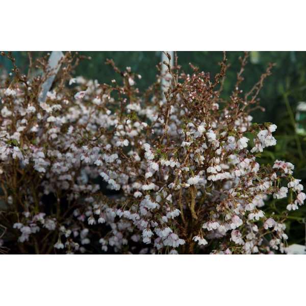 Fijne zigzagvormige takken die rijkelijk bloeien met kleine witroze bloempjes.