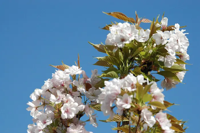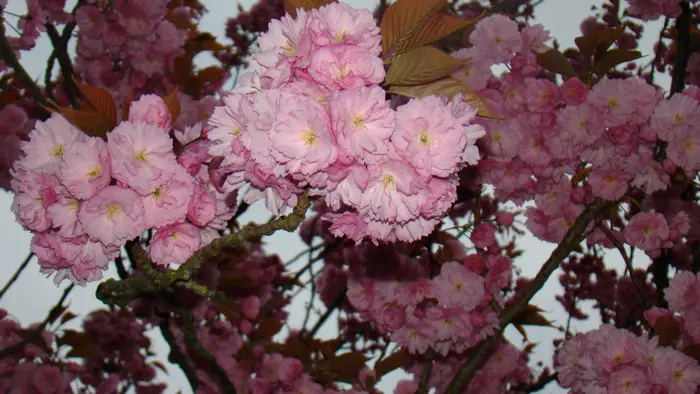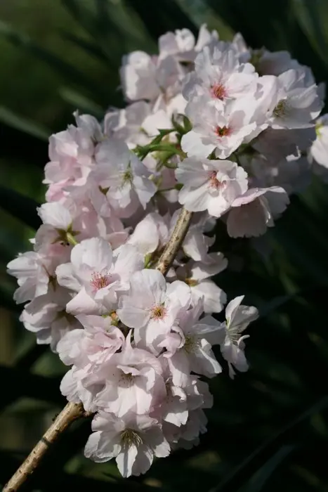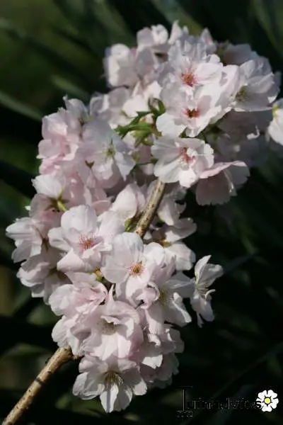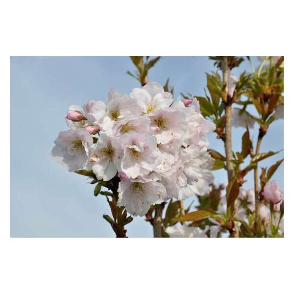 Prunus serrulata 'Amanogawa' heeft een smalle zuilvormige, opgaande groei met halfgevulde zachtroze tot wit verkleurende bloemen.