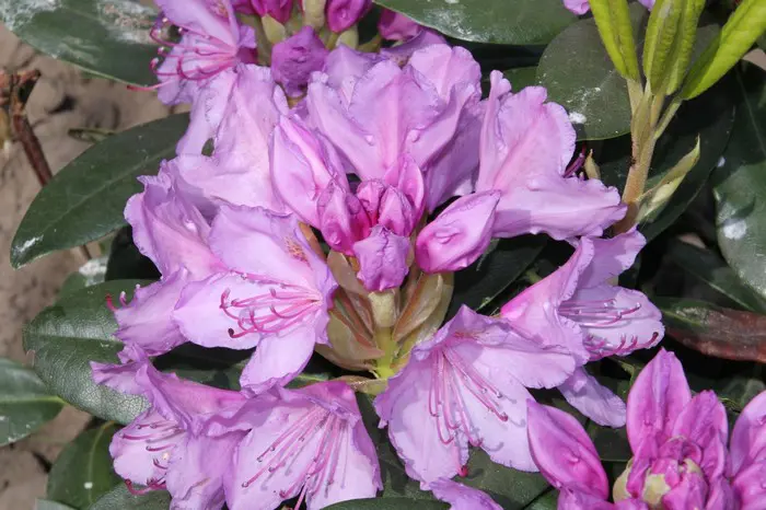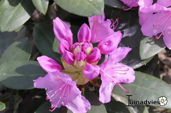 Rhododendron 'Blue Silver' is een laagblijvende struik met donker grijsgroene, kleine ovale bladeren.