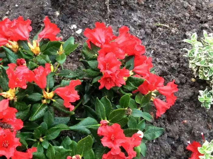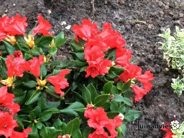 Rhododendron 'Baden-Baden' is een laagblijvende brede struik (80x100cm).