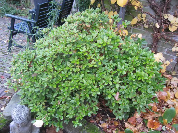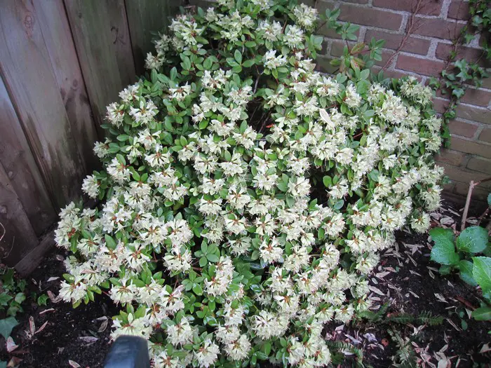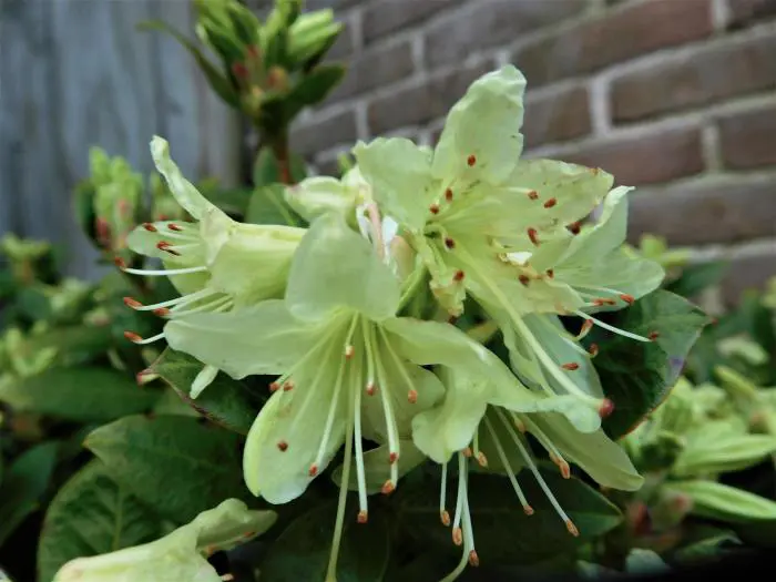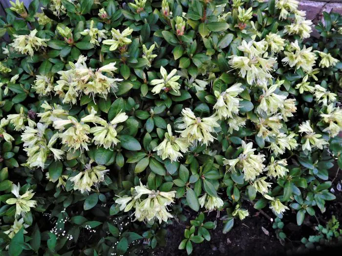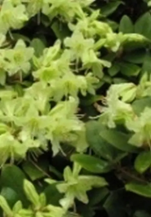 Rhododendron 'Shamrock' is een dwergsoort van 40cm hoog, bloeiend met zachtgele bloemen.