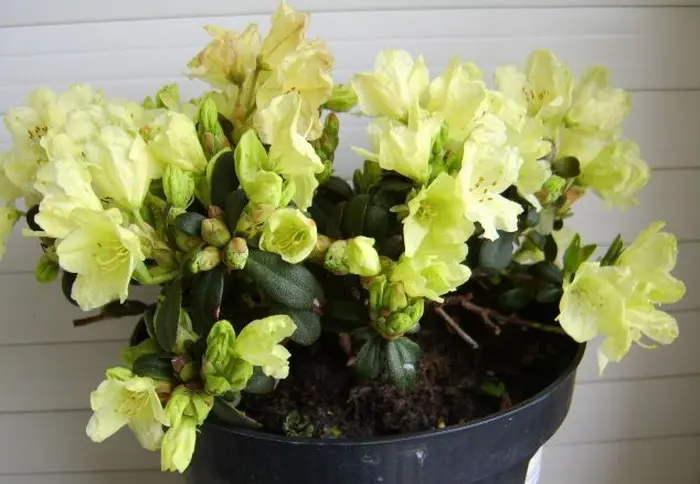 Rhododendron 'Wren' is een Keiskei-hybride met tamelijk grote cremegele trompetachtige bloemen.