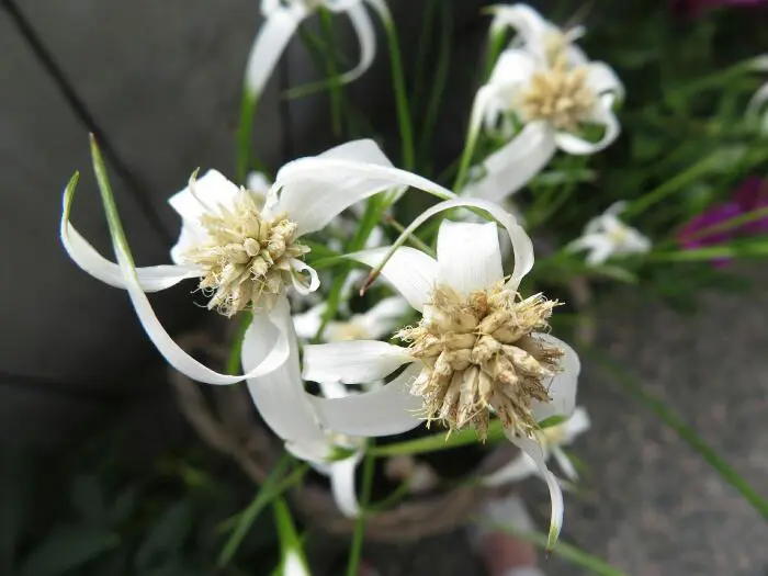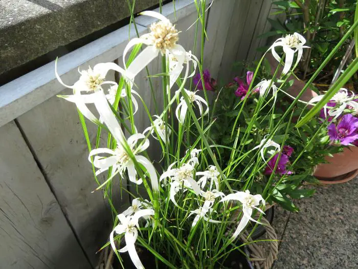 De bloeiwijze heeft de vorm van 1 tot 3 witte aartjes die later bruin kleuren.