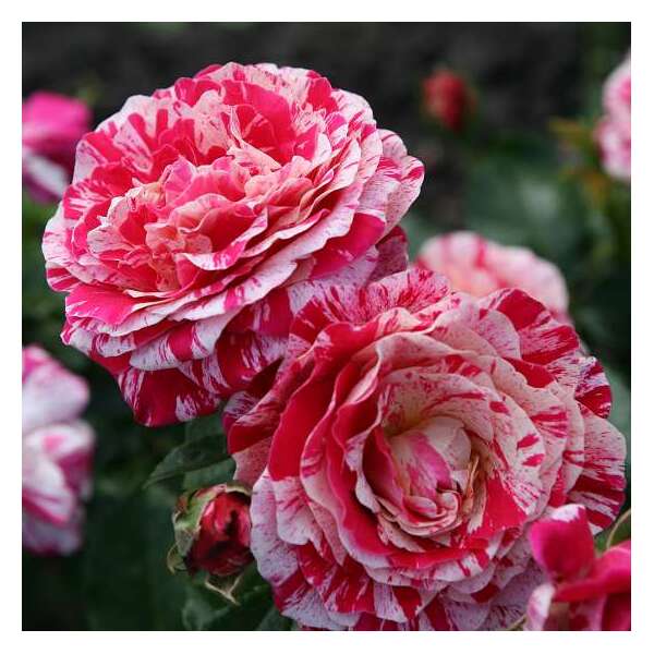 Rosa 'Abracadabra' is een goed herbloeiende, (bijna) doornloze roos met bruinrood/citroengeel gestreepte, dubbele bloemen.