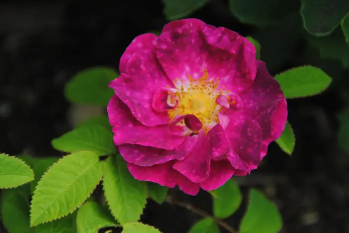 Rosa 'Alain Blanchard' vormt een grote bossige, doornige struik met donkergroene bladeren.