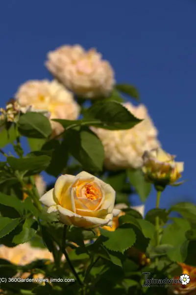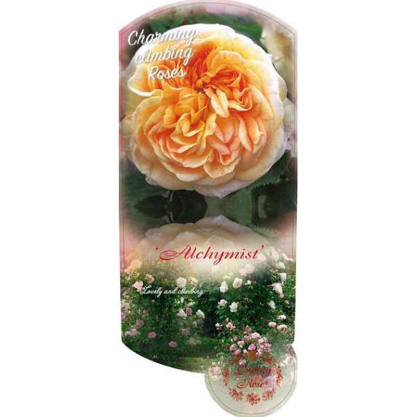 Sterk geurend gekwartierde volle bloemen, eerst oranje, goudgeel dan abrikoos en later verkleurend naar roze.