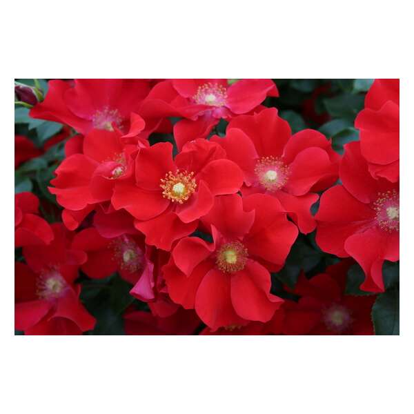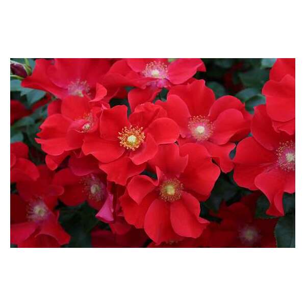 Rosa 'Alexander Von Humboldt' is een zeer gezonde roos met trosjes enkelvoudige felrode bloemen (ø 5-6cm) en een hart van goudgele meeldraden.