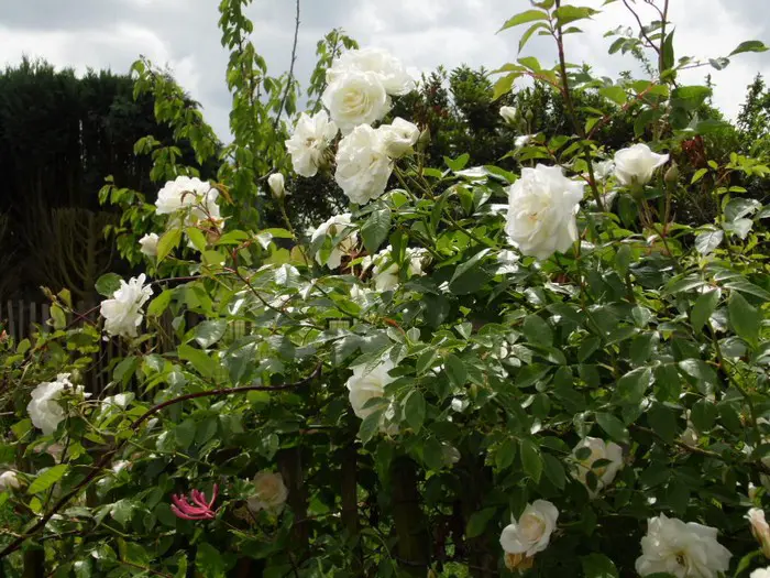 De kleur van de roos is wit maar met een gele ondertoon, takken hebben weinig doorns en het blad is glanzend en lichtgroen.