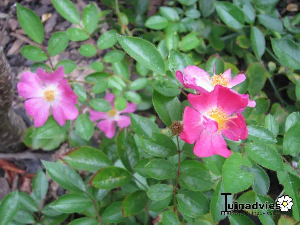 Enkelvoudige donkerroze roosjes met een kersrode nuance en gele meeldraden gevolgd door rode bottels.