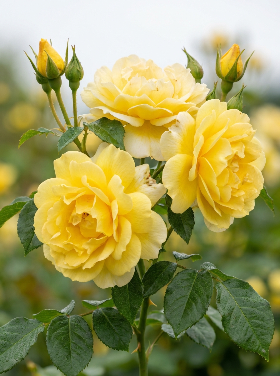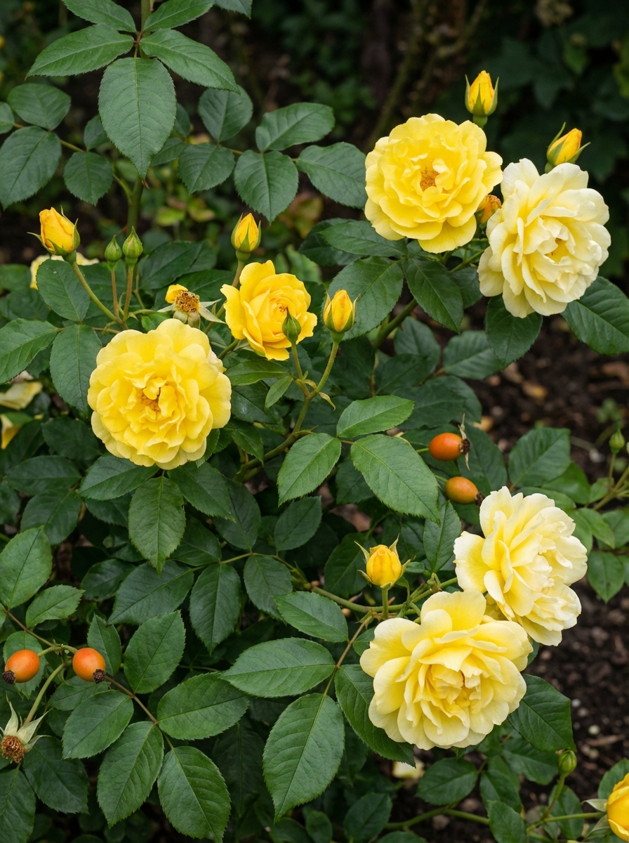 Een vroegbloeiende klimroos dat al in mei begint te bloeien met grote citroengele bloemen dat al snel verkleuren naar witgeel.